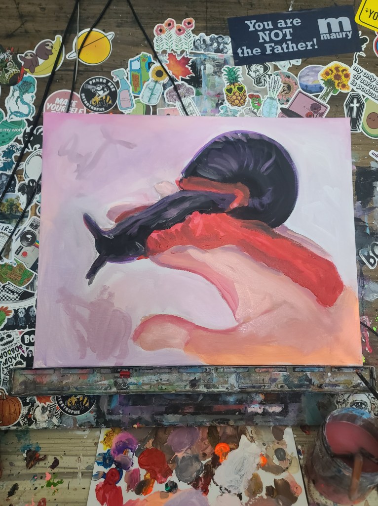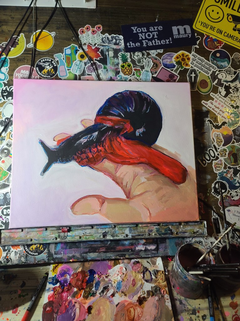 Just a painting of a cool slug. No special meaning, just pleasantly slimey.